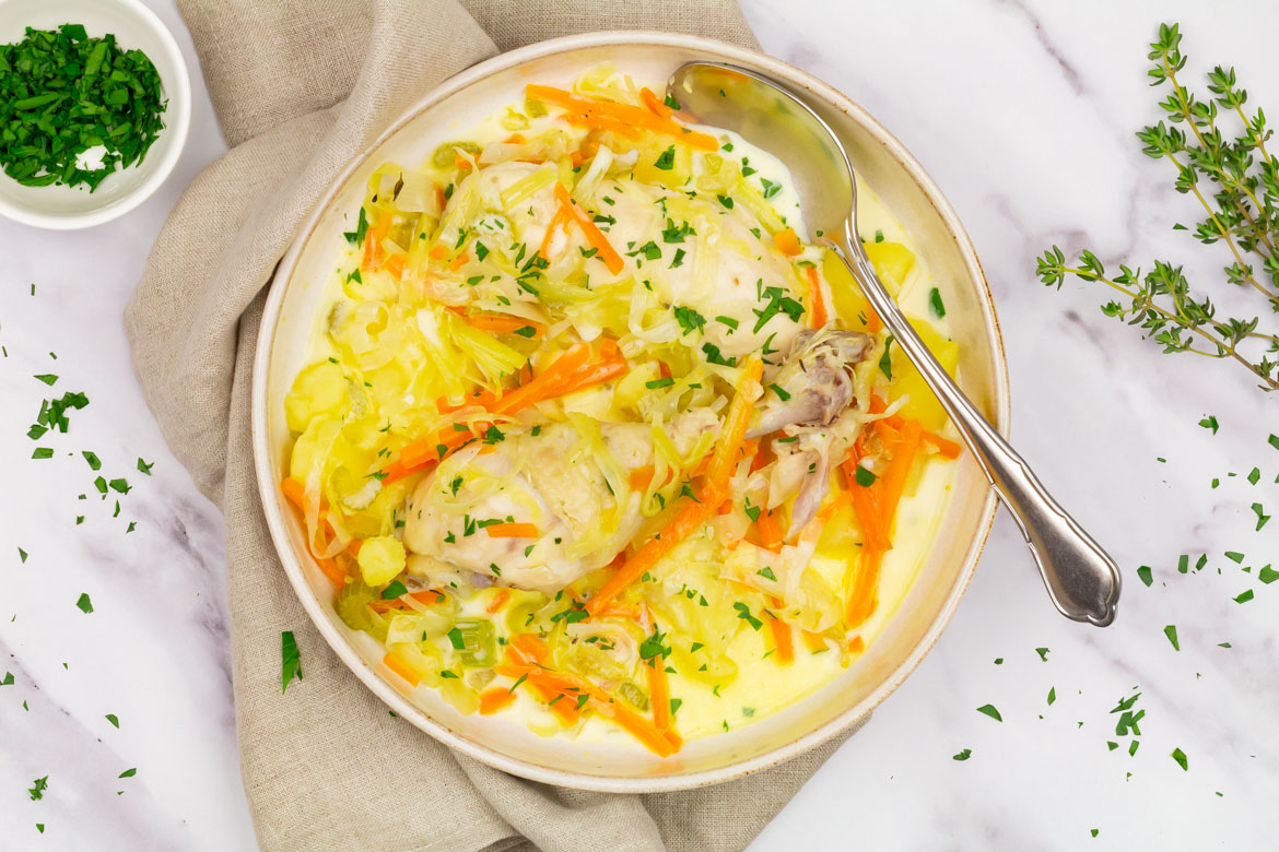 Groenten zoals bleekselderij, prei en winterpeen zorgen voor een frisse tegenhanger en geven de stoof zijn kenmerkende geur en smaak. En dan is er natuurlijk de romige toevoeging: een mengsel van kookroom en eidooier dat vlak voor het serveren met wat bouillon wordt vermengd en vervolgens bij de kip, groenten en aardappelen wordt geschonken.