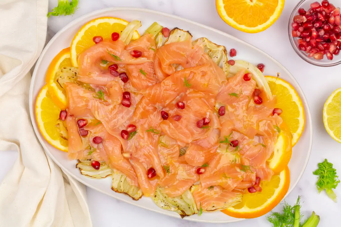Serveer de carpaccio met wat extra sinaasappelpartjes en een plukje venkelgroen. Als je wil variëren, kan je ook nog denken aan wat gesneden groene olijven, fijngesneden dille of wat grofgehakte pistachenoten. Ze geven een kleine extra toevoeging, maar de basis blijft hetzelfde. Deze combinatie van zalm, citrus, venkel en granaatappel laat zien dat een voorgerecht niet ingewikkeld hoeft te zijn om verzorgd en feestelijk te voelen. Een fris gerecht dat eigenlijk altijd kan.